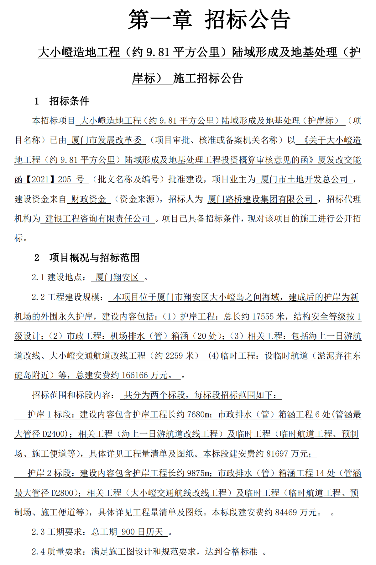 16億大項目!廈門大小嶝造地工程! 發布日期:2021年06月04日 瀏覽次數:3768 關鍵字: 公司 項目基本信息招標項目編號: E3500000717002736002招標人: 廈門路橋建設集團有限公司招標代理名稱: 建銀工程咨詢有限責任公司招標類型: 施工招標方式: 公開招標聯系電話: 13616032431